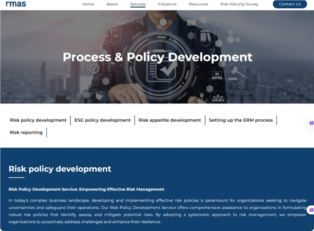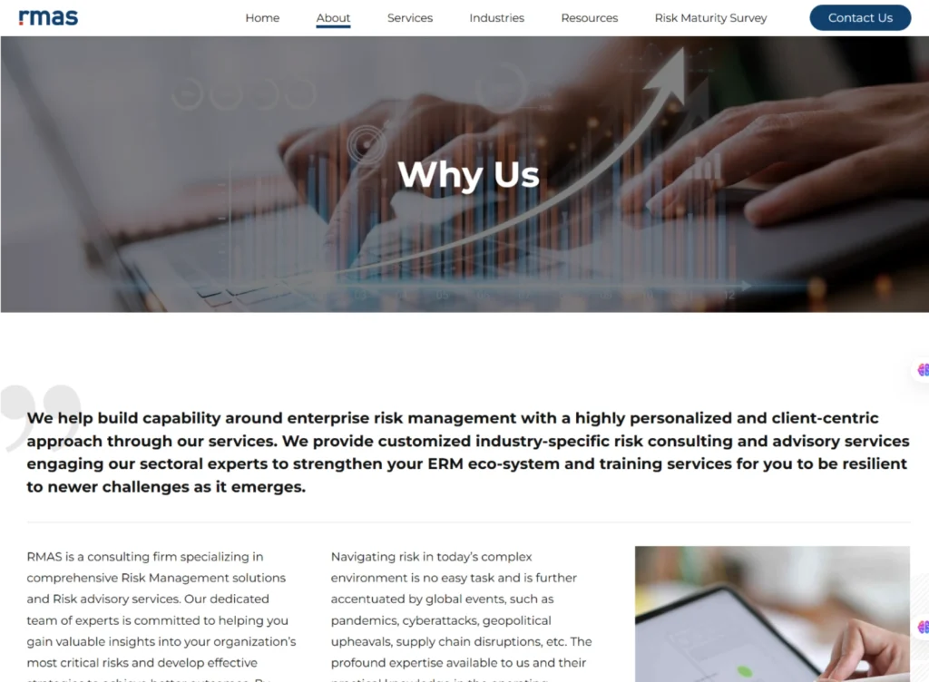 RMAS (Risk Management Advisory Services) is a Mumbai-based consulting firm specializing in enterprise risk management, compliance, and Virtual CRO services. With a growing portfolio of risk-focused offerings, RMAS required a credible digital identity that communicated trust, precision, and authority to enterprise clients